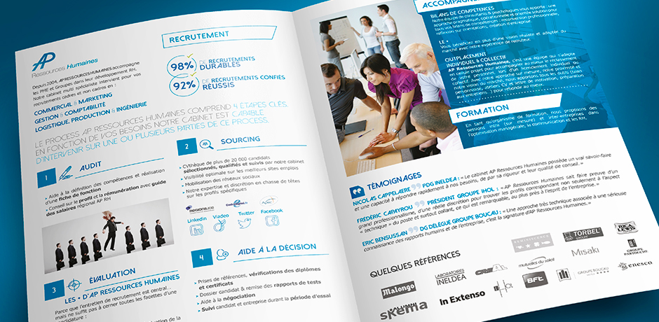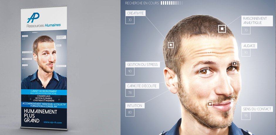Réalisation de supports d’édition pour AP Ressources Humaines : carte de visite, dépliant, roll up