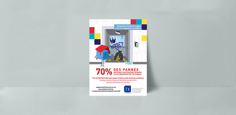 Nous réalisons donc depuis de nombreuses années l’ensemble des documents d’information et de communication auprès des locataires, des institutionnels et du grand public. Selon les messages et les thèmes, nous pouvons parfois utiliser de belles photos de mise en situation, mais il s’agit aussi sur certains documents de sensibiliser, et d’accompagner une conduite du changement sans réprimander pour autant. Nous avons eu également recours à des illustrations et dessins faits entièrement par nos créatifs pour expliquer et faire comprendre, sans dénoncer pour autant. Les supports sur lesquels nous travaillons sont nombreux (rapport d’activité annuel, panneaux, affiches, dépliants, journal mensuel…)