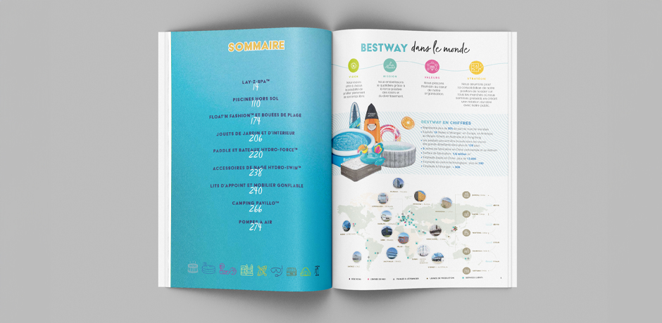 Retour en images sur la réalisation du catalogue Bestway France. Un travail de conception graphique minutieux et rigoureux, dont l’objectif est la mise en valeur des plus de 1000 références et produits de la marque de manière claire et efficace, en créant des mises en situation fun et colorées en adéquation avec l’univers Bestway, tout en privilégiant une mise en avant technique pour les revendeurs !