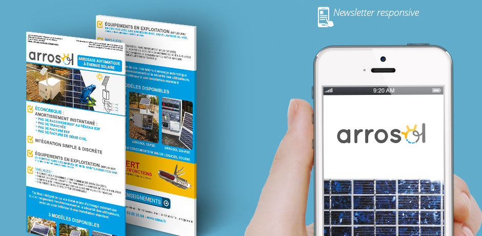 Puis, c’est une campagne qui a été lancée pour faire connaître les bienfaits Arrosol à ses cibles, à savoir les possesseurs de grands espaces verts. Notre conseil et notre action ont porté sur des actions hors media, avec la réalisation d’un mailing et d’un e-mailing à destination des Maires et Directeurs des Services techniques de la région PACA et du département de l’Hérault, pour commencer. L’agence a donc conçu cette opération (charte, mise en page, routage, programmation, analyse des retombées) mettant en avant les avantages de la solution Arrosol, économique et novatrice.